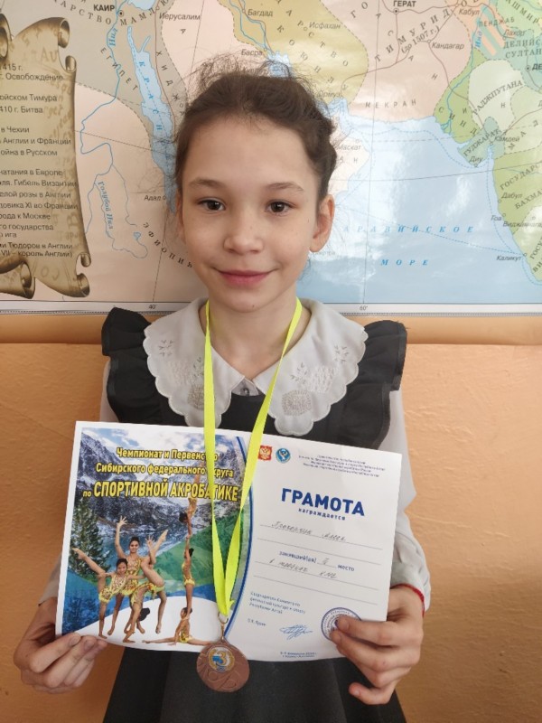 Обучающаяся 4 класса Прохорчик Алеся заняла III место в тройках КМС Чемпионата и Первенства Сибирского Федерального округа по спортивной акробатике